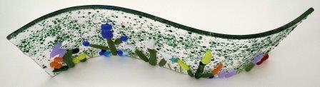 A fused Flower scene with frit grass background. Slumped over a wave mould to create a self-standing scene.