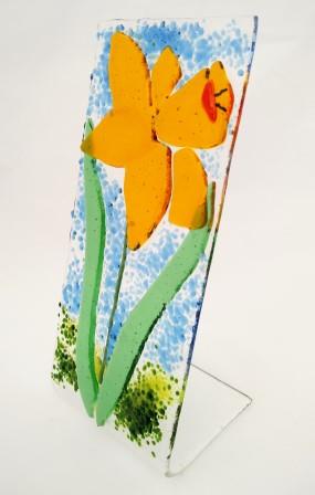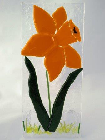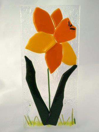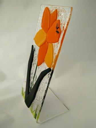 A Fused Daffodil picture slumped over a mould to create a self-standing Daffodil. Orange Petals with Yellow Corona, with Green leaves, stem, and grass.